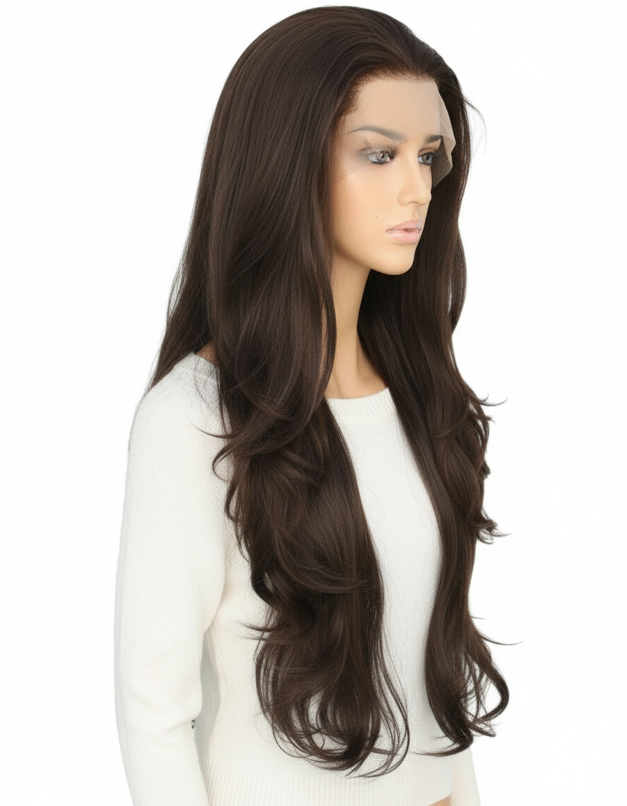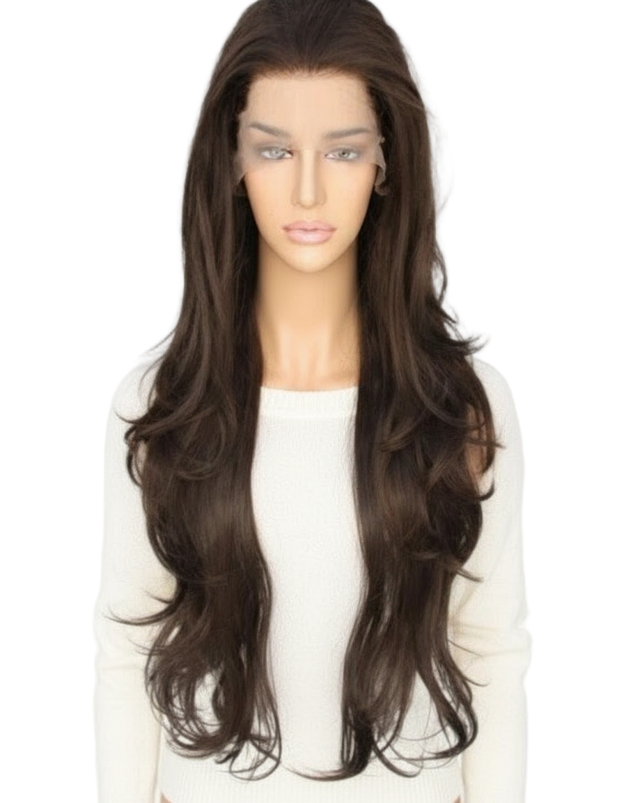 Step into effortless elegance with our pre-styled lace front wig, crafted for confidence and convenience. This long, wavy masterpiece features a rich dark brown hue with a soft, natural wave pattern that flows beautifully.